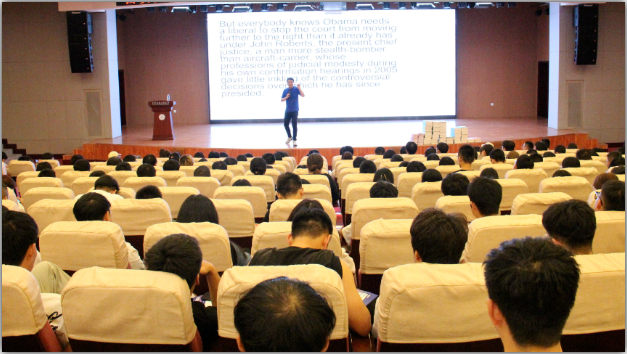何凯文老师幽默开讲,与学生频繁互动,他用英语例句为大家做优秀示范,其流利纯正的发音、独到的见解、睿智的思维、轻松幽默的语言和激情的授课方式,赢得了现场阵阵掌声。