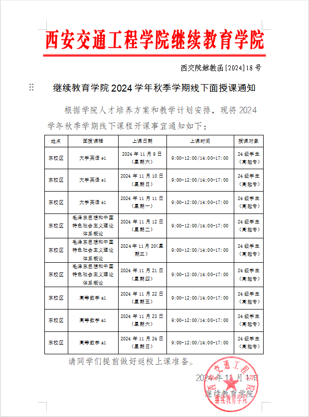 伟德国际victor19462024学年秋季学期线下面授课通知