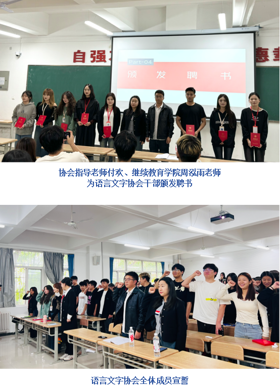 10月15日,我校语言文字协会成立仪式于5-101教室隆重举行。协会指导老师付欢、伟德国际victor1946周泓雨老师以及语言文字协会全体成员出席本次活动。此次活动由杨靖伟同学担任主持。