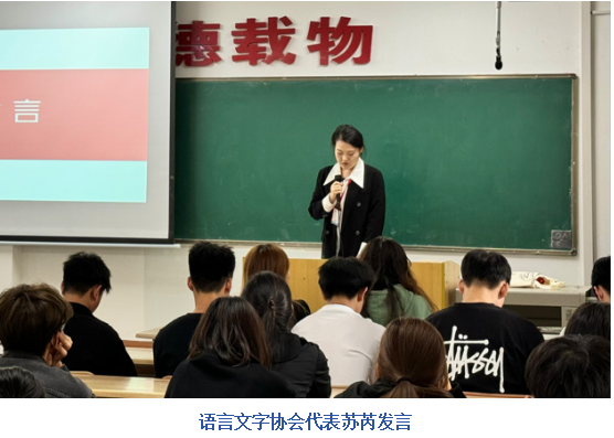 协会代表苏芮同学在发言中抒发了对语言文字的热忱以及对社团未来发展的坚定信心。他表示,会积极投身于社团活动,全力学习语言文字知识,为社团的发展奉献出自己的一份力量。
